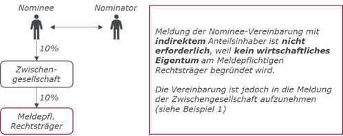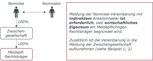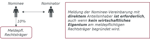 Nominee-Vereinbarungen, die wirtschaftliches Eigentum am meldepflichtigen Rechtsträger begründen, erfordern eine Änderungsmeldung binnen vier Wochen ab Abschluss der Vereinbarung. Solche Vereinbarungen, die wirtschaftliches Eigentum begründen, waren bereits nach der bisherigen Rechtslage zu melden. Durch die Novelle kommt es zu keiner Änderung.